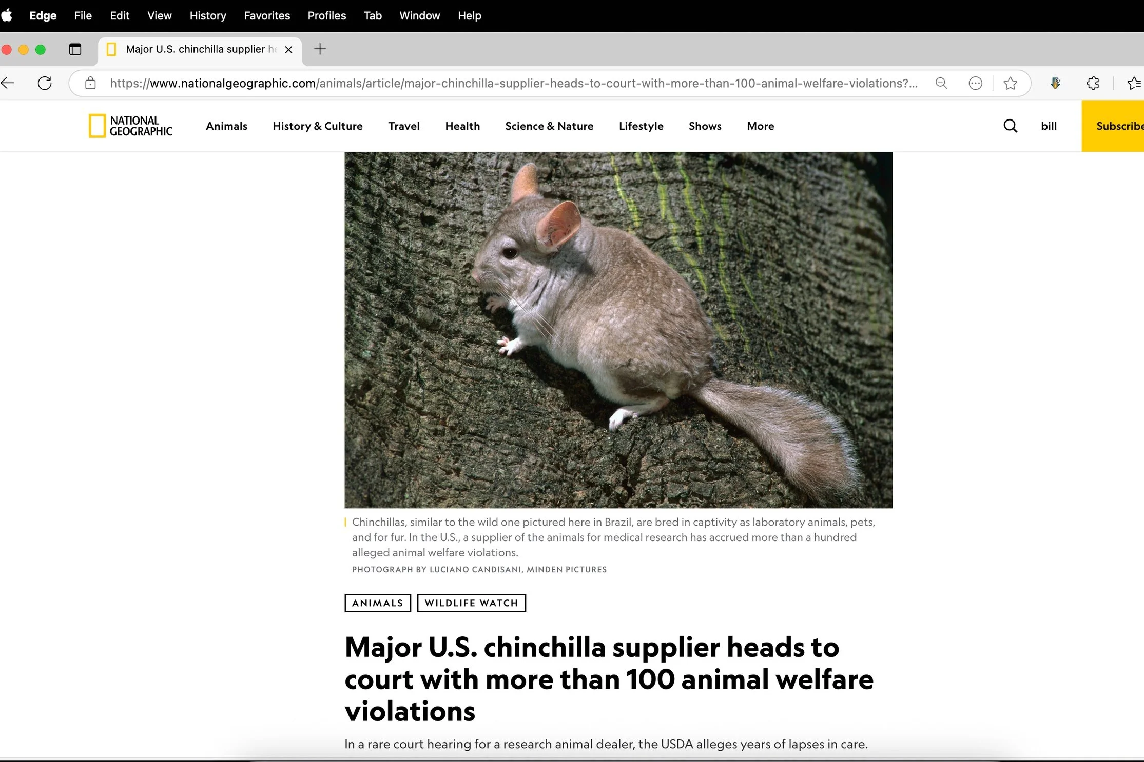 In early 2020, Eric wrote the first of five articles in the AWI Quarterly based on his research and analysis of Moulton Chinchilla, which was the longest-tenured supplier of chinchillas for invasive experimentation. He focused on Moulton’s execrable record of animal care, USDA’s appalling failure to act, and the fact that prominent researchers continued to purchase from him despite this egregious record.